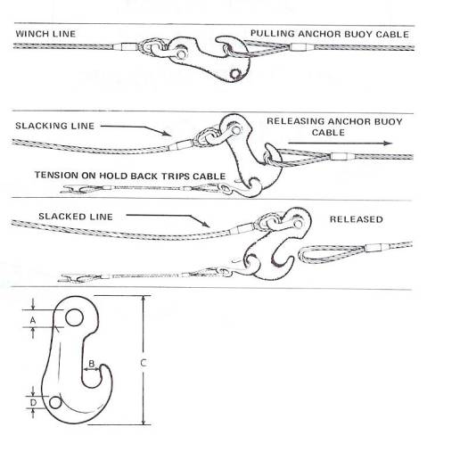 it is very useful in returning and setting anchor around marine pipe cable loop or eye and wind it on winch drum of tug boat. When anchor is off ocean floor and boat reaches its desired distance from barge, the boat begins to release the winch line. When anchor hook reaches approximately half way off stern of boat, insert small hook on hold back line in bottom hole of anchor line hook. When releasing winch line further, the hold back line will get tight causing the anchor line hook to trip or release loop or eye of buoy cable automatically.