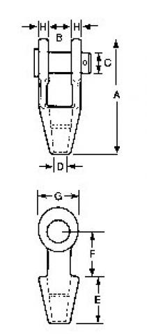 Efficiency of spelter terminations: 100% of the catalog breaking strength of wire rope. These drawings illustrate one groove used on sockets 1/2" & smaller. Sizes 9/16"-1.1/2" have two grooves. Sizes 1.3/4" & larger have three grooves.