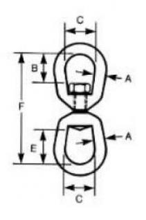 | Size (A) | Work Load Limit LBS. | Approx. Wt. ea. LBS. | Ins. B | Ins. C | Ins. E | Ins. F |