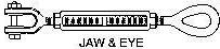 | Size Dia. x Take-up | Approx. Wt. ea. in lbs. Eyes and/or Hooks | Approx. Wt. ea. in lbs. Jaw & Eye | Approx. Wt. ea. in lbs. Jaw & Jaw | Work Load Limit in lbs. Hook&Hook/Hook&Eye | Work Load Limit in lbs. Eye&Eye/Jaw&Eye/Jaw&Jaw | Avg.Ovrall Length with Ends in Closed Position |