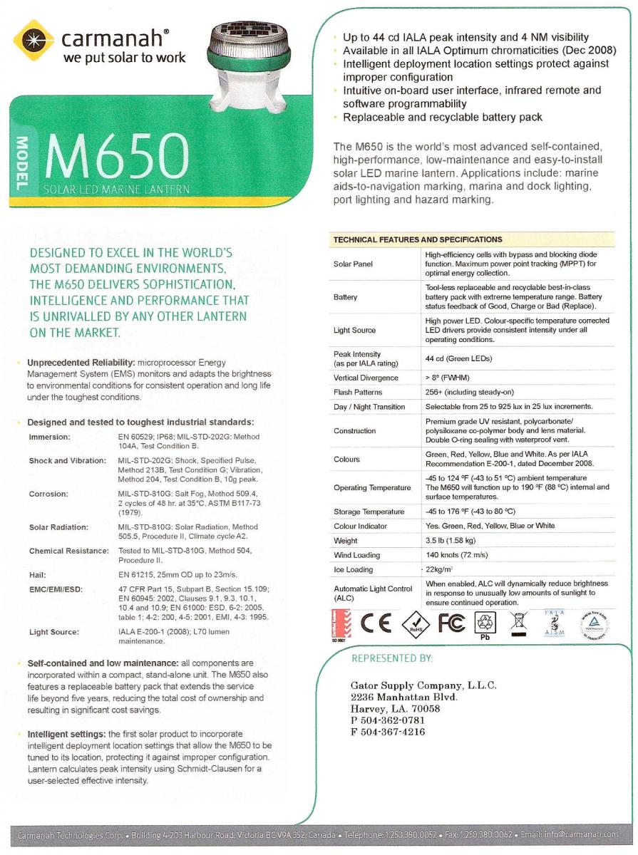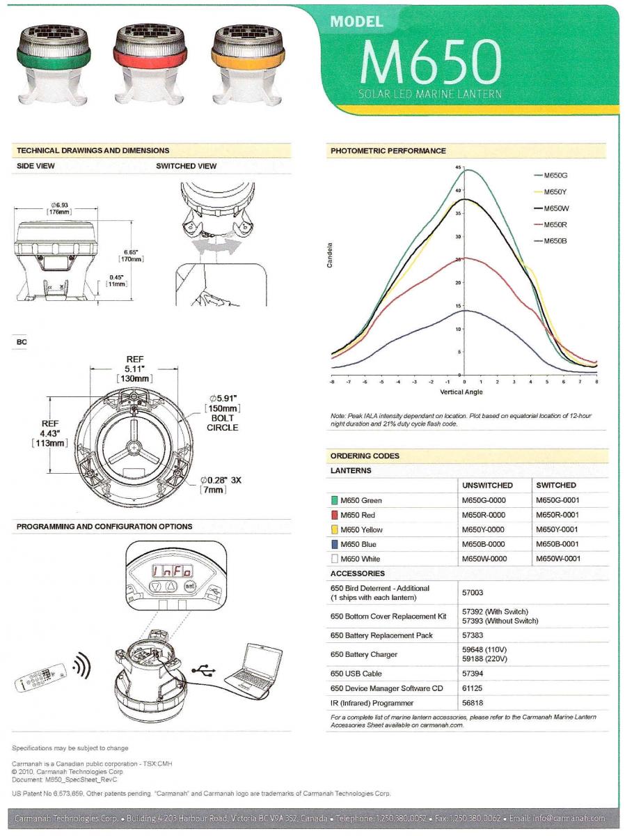 Model 650 The M650 is the world's most advanced self-contained, high-performance, low maintenance and easy-to-install solar LED marine lantern. Applications include: marine aids-to-navigation marking, marina and dock lighting, port lighting and hazard marking. Unprecedented Reliability: microprocessor Energy Management System (EMS) monitors and adapts the brightness to environmental conditions for consistent operation and long life under the toughest conditions. Specifications for Model 650 |