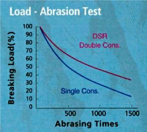 Due to a technically reinforced composition of high tenacity Superdan and polyester yarns, Super Combo has retained its superior strength. When combined with DSR's unique double construction cover yarns, this composition provides superior abrasion resistance comparing to conventional constructed ropes. This has been verified through frequent and repeated uses in mooring application. (Test result shown below)